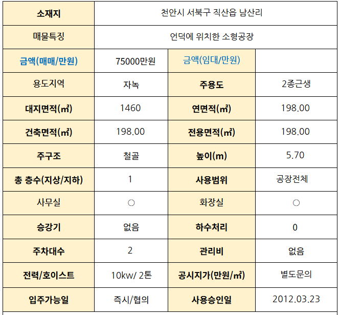 천안시 서북구 직산읍 남산리 공장 매매 442/60p 7.5억원