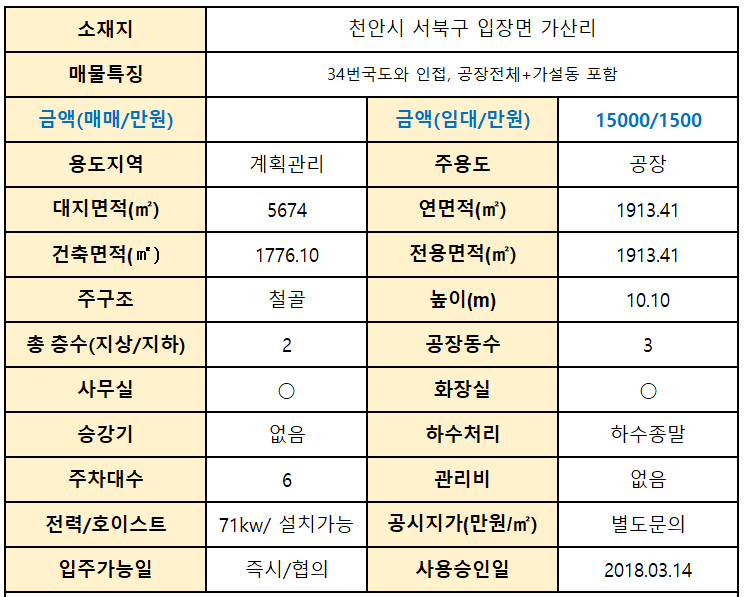 천안시 서북구 입장면 가산리 공장 임대 579p 15000/1500만원